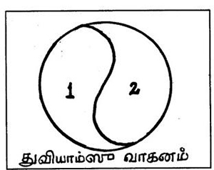 இவ்வாறாக, சிருஷ்டியின் போது கிராத மூர்த்தியின் வாகனமான நந்தீஸ்வரரின் வேகத்திற்கு ஈடுகொடுக்க முடியாமல் தவித்த ஸ்ரீலட்சுமி, பராசக்தியை வேண்டிட, அகிலாண்டேஸ்வரி,, “துவியாம்ஸு” என்ற ஒரு வாகனத்தை அளித்திட்டாள்.. துவியாம்ஸு வாகனமானது இரு மாம்பழங்களை இணைத்தாற் போலிருக்கும் (துவி – இரண்டு, ஆம் – மா). பெரும்பாலான ஆலயத் தூண்களில் இன்றும் இவ்வடிவைக் காணலாம். ஐசிங் என்று பிற மொழிகளில் கூறப்படும் துவியாம்ஸு வேத, மந்த்ர, யந்த்ர, தந்த்ர, வாமன, யோக, மூலாதார, தெய்வீக சக்கரங்களுள் ஒன்றாகும். ஸ்ரீஅகஸ்திய மஹாபிரபுவின் தலையாய சிஷ்யர்களுள் ஒருவரான போகர் சித்தர் தம் தபோபலத்தால் விண்ணிலிருந்து கிரஹித்து இதைக் கோயில் சிற்பக் கலைகளில் கூட்டினார். இந்தச் சக்கரத்தை முறையாக வரைந்து குறித்த பூஜைகளைக் குரு அருளுடன் நிறைவேற்றிட ஐஸ்வர்ய கடாட்சம் பொங்கும்.. ஆதிகாலத்தில் வெள்ளிக்கிழமைகளில் தூண்களில் உள்ள துவியாம்ஸு ரூபத்திற்கு அரிசிமாவுக் கோலமிட்டு மஞ்சள், சந்தனம், குங்குமமிட்டு முழுத் தாமரை, மலர்களிட்டு வணங்குவர். இன்றும் இதனைச் செய்து வளம் பெறுவீர்களாக.. வறுமையைப் போக்கும் எளிய ஆன்மீக மருந்திது!! ஸ்ரீநரசிம்மரைத் தேடிச் சென்ற ஸ்ரீமஹாலட்சுமி தேவி, பராசக்தி அளித்த துவியாம்ஸு வாகனத்தில் அமர்ந்து பல லோகங்களுக்கும் விரைந்தனள்..... ஆகாயத்தினூடே . துவியாம்ஸு பறந்திட...