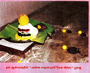 இறையருளால் நம் குருமங்கள கந்தர்வா ஸ்ரீவெங்கடராமன் அவர்கள் இரு கண் தேங்காயாக இரு கண் ஓட்டு லிங்க வழிபாட்டின் மகிமையை, அடியார்களுக்கு உணர்த்தி, இதனால் அன்னமாதன நாரிகேள லிங்கத்தை வழிபடும் முறையையும் நடத்தித் தந்தார்கள்.. கடந்த பௌர்ணமியில் இந்த இருகண் தேங்காயை பூஜையில் வைத்து, அத்தேங்காயை பாணலிங்கமாகவும், நன்முறையில் சுத்திகரிக்கப்பட்டு வடிக்கப்பட்ட அன்னமே ஆவுடையாக்கப்பட்டு, இரு ஓட்டுத் தேங்காய் லிங்க பூஜையாக அமைந்தது கண்கொள்ளாக் காட்சியாகும். இதனுடைய திருஉரு திருப்படத்தைத்தான் இங்கு நீங்கள் கண்டு மகிழ்கின்றீர்கள்! ஒரு கண் சிவ அம்சமாகவும், மற்றொன்று சக்தி அம்சமாகவும், விளங்கி இந்த அன்னமாதன நாரிகேள லிங்கமானது, நம் ஆஸ்ரமத்தின் எதிரே அண்ணாமலையில் நாம் பெறக்கூடிய சிவசக்தி ஐக்கிய ஸ்வரூப மலைதரிசனத்தை நோக்குமாறு, அருணாசலப் பெருமானின் நேத்திர யோக மேற்பார்வையில் வைக்கப்பட்டு, சுமார் பன்னிரெண்டு மணி நேரங்களுக்கு மேலாக அபிஷேக ஆராதனைகளுடன் ஆராதிக்கப் பெற்றது.