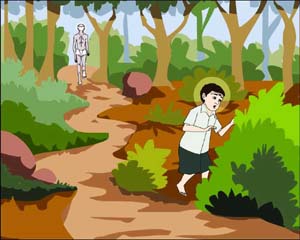இருந்தாலும் என்ன செய்வது? பெரியவரோ கல்லைத் தேடி எடுத்துவரச் சொல்லி விட்டு முன்னால் போய் விட்டார். சிறுவன் ஒவ்வொரு புதராக விலக்கி விலக்கிப் பார்த்துத் தேட ஆரம்பித்தான்.