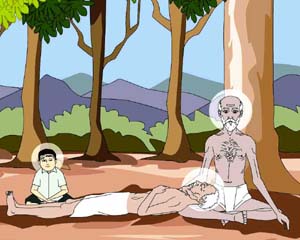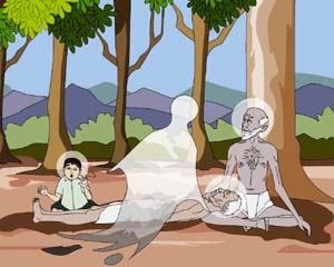 நல்ல தேஜஸ் நிறைந்த முகம்! அந்த நிலையிலும் அவர் முகத்தில் இருந்த சிரிப்பு மாறவே இல்லை. மிக மிக அமைதியான தோற்றத்தோடு, சாதாரணமாக உறங்குவதுபோல பெரியவரின் மடியில் அவர் படுத்திருந்தது சிறுவனுக்கு எதையோ உணர்த்தியது.