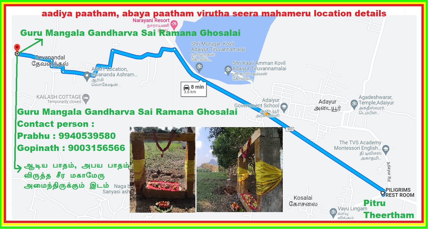 நம் சற்குருவின் 51வது ஜீவ சமாதி அமைந்த திருஅண்ணாமலை ஆடையூர் திருத்தலத்தில் இரு விருத்தசீர சுமைதாங்கிகள் நம் அடியார்களால் நிறுவப்பட்டன. நம் கோவணாண்டி பெரியவரே சிறுவன் வெங்கடராமனின் 51வது ஜீவ சமாதி அமையும் இடத்தைச் சூட்சுமமாகக் குறிப்பிட்டார். இதன் காரணம் என்ன? மகரிஷிகள் அனைவருக்கும் பாத பூஜைகைள் நடைபெற்றதே குபேர லிங்கம் அமைந்துள்ள கிரிவலப் பாதை பகுதியாகும். சற்குருவின் பாதக் கமலங்களை குறிக்கும் விதமாக நம் அடியார்களால் இரு விருத்தசீர சுமைதாங்கிகள் அமைக்கப்பட்டன, இதுவே நம் சற்குருவின் தொலை நோக்குப் பார்வை அடியார்களுக்கு சுட்டிக்காட்டும் மகத்துவமாகும். ஆடையூர் திருத்தலத்தில் துலங்கும் இந்த இரு சுமைதாங்கிகளையும் நம் சற்குருவின் திருப்பாதங்களாக பாவித்து வழிபாடுகள் நிகழ்த்துவதால் திரளும் பலன்களை வர்ணிக்கத்தான் இயலுமா?