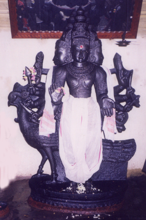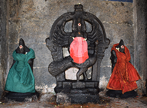 முருகனுக்கு இடப் புறம் மயிலின் தலை இருக்கும் கோலம்,