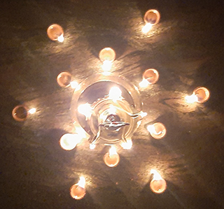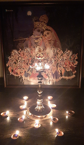 இல்லங்களில் தீபங்களை ஏற்றி வழிபாடுகளை இயற்றும் முறையை இங்குள்ள படத்தின் மூலம் அறிந்து கொள்ளலாம். மேற்கண்டவாறு எண் எட்டு முறையில் ஒரு குடம் தண்ணி ஊத்தி என்றவாறு வழிபாடுகளை இயற்றும்போது இத்தகைய எட்டைக் குறிக்கும் அமிர்த ஜோதிகளை இல்லங்களில் ஏற்றி வைத்து வழிபாடு நிறைவுறும் வரை தீபங்களை ஒளி வீசச் செய்வதாலும் சிறப்பான குடும்ப ஒற்றுமை, சமுதாய ஒற்றுமை சக்திகளை, கிருஷ்ணாமிர்த சக்திகளை பக்தர்கள் உருவாக்கலாம். இத்தகைய வழிபாட்டில் கௌராங்கர் என்று அழைக்கப்படும் சைதன்ய மகா பிரபு ராதையுடன் இணைந்த கிருஷ்ண பகவானை தரிசித்தாராம். இந்த அற்புதத்தை சூட்சுமமாக வர்ணிப்பதே இங்கு நீங்கள் காணும் சித்திரம்.