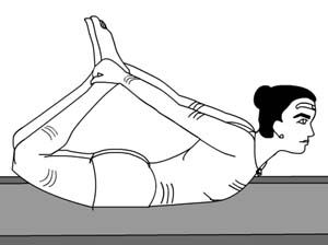குப்புறப் படுத்துக் கொள்ளவும். இரண்டு கைகளால் இரண்டு கால் பாதங்களைப் பிடித்துக் கொண்டு உடலை வில்லாக வளைக்கவும். மூச்சுக் காற்றை உள்ளே இழுத்து மூன்று விநாடிகள் வைத்திருக்கவும். மூச்சை வெளியே விட்டு கால் தலையை இறக்கவும்.