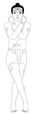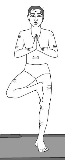 9. நேராக நிற்கவும் இடது காலை மடித்து வலது தொடையில் வைக்கவும். கைகளைக் குவித்து மார்புக்கு நேரா வணங்கிய நிலையில் வைத்துக் கொள்ளவும். கண் இமைக்காமல் நேரே எதிரில் உள்ள கடவுள் படத்தைப் பார்க்கவும். மூச்சை சாதாரணமாக இழுத்து விடவும். வலது காலை மடித்து வைத்து எவ்வளவு நேரம் ஆசனம் பயின்றீர்களோ அதே அளவு நேரத்திற்கு இடது காலை மடித்து ஆசனம் பயிலவும்.