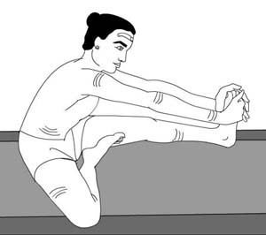 இவ்வாறு ஒரு மாத காலம் தொடர்ந்து பயிற்சி செய்து வந்தால் உங்கள் முதுகுத் தசைகள் மென்மை அடைந்து நீங்கள் எளிதில் உங்கள் கைகளால் கால் விரங்களைத் தொடும் நிலைக்கு வந்து விடுவீர்கள். அதன் பின்னர் இரு கால்களையும் நீட்டி அமர்ந்து கொண்டு கை விரல்களால் கால் விரல்களைப் பிடித்துக் கொண்டு தினமும் ஒரு மணி நேரத்திற்குக் காயத்ரீ மந்திரம் ஓதி வரவும். அதன் பின்னர் நீங்கள் எளிதாக படத்தில் காட்டியபடி இரு கைவிரங்களையும் கோர்த்து கால் பாதங்களைப் பிடிக்கும் அளவிற்கு வந்து விடுவீர்கள் இந்நிலையை அடைந்து விட்டால் அதன் பின்னர் உங்களுக்கு நிச்சயம் பத்மாசனம் என்பது ஒரு எளிதான பயிற்சி ஆகிவிடும்.
