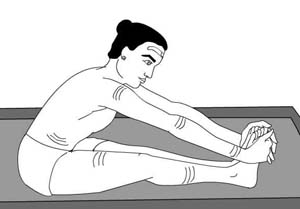 முதலில் படத்தில் காட்டியபடி இடது காலை நீட்டி வலது காலை மடித்து அமர்ந்து கொள்ளவும். இரு உள்ளங்கைகளும் ஒன்றையொன்று பார்க்குமாறு வைத்துக் கொண்டு அவைகளுக்கு நடுவே கால் விரங்களைப் பார்க்கவும். இந்நிலையில் உங்களால் கைகளால் கால் விரங்களைத் தொட முடியாது. ஆனாலும், கைகளின் வழியே உள்ள இடைவெளி வழியாக கால் கட்டை விரலைப் பார்த்துக் கொண்டு காயத்ரீ மந்திரத்தையோ அல்லது தேவாரப் பதிகங்களையோ ஓதிக் கொண்டு இருக்கவும். சுமார் அரை மேணி நேரத்திற்குப் பின் வலது காலை நீட்டி இடது காலை மடக்கி மேற்கூறிய வண்ணம் பயிற்சி செய்யவும்.