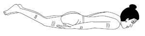 6. குப்புறப் படுத்துக் கொள்ளவும். தலையைத் தூக்காமல் நேரே பார்க்கவும். கைகளைப் பக்கவாட்டில் உள்ளங்கைகள் வானத்தைப் பார்க்குமாறு வைத்துக் கொள்ளவும். இரண்டு கால்களையும் ஒன்றாகச் சேர்த்து முட்டி மடங்காமல் முடிந்த அளவு உயரத் தூக்கவும். மூன்று விநாடிகள் மூச்சுக் காற்றை உள்ளே இழுத்து வைத்துக் கொள்ளவும். மூச்சுக் காற்றை வெளியே விட்டு கால்களை இறக்கவும்.